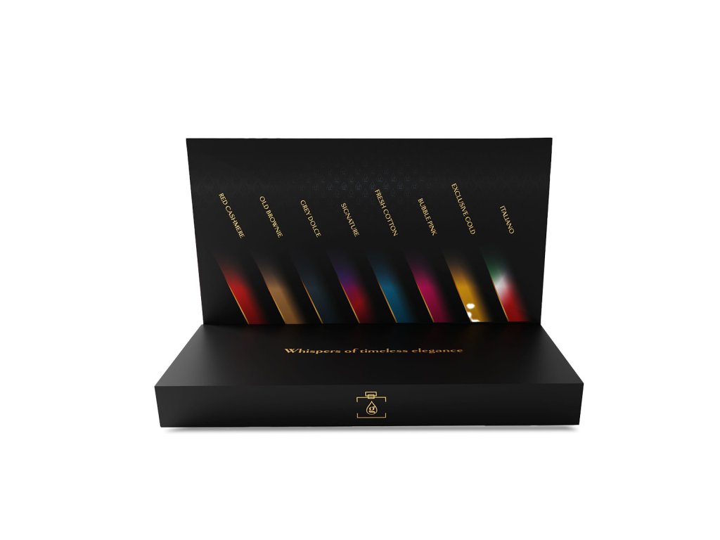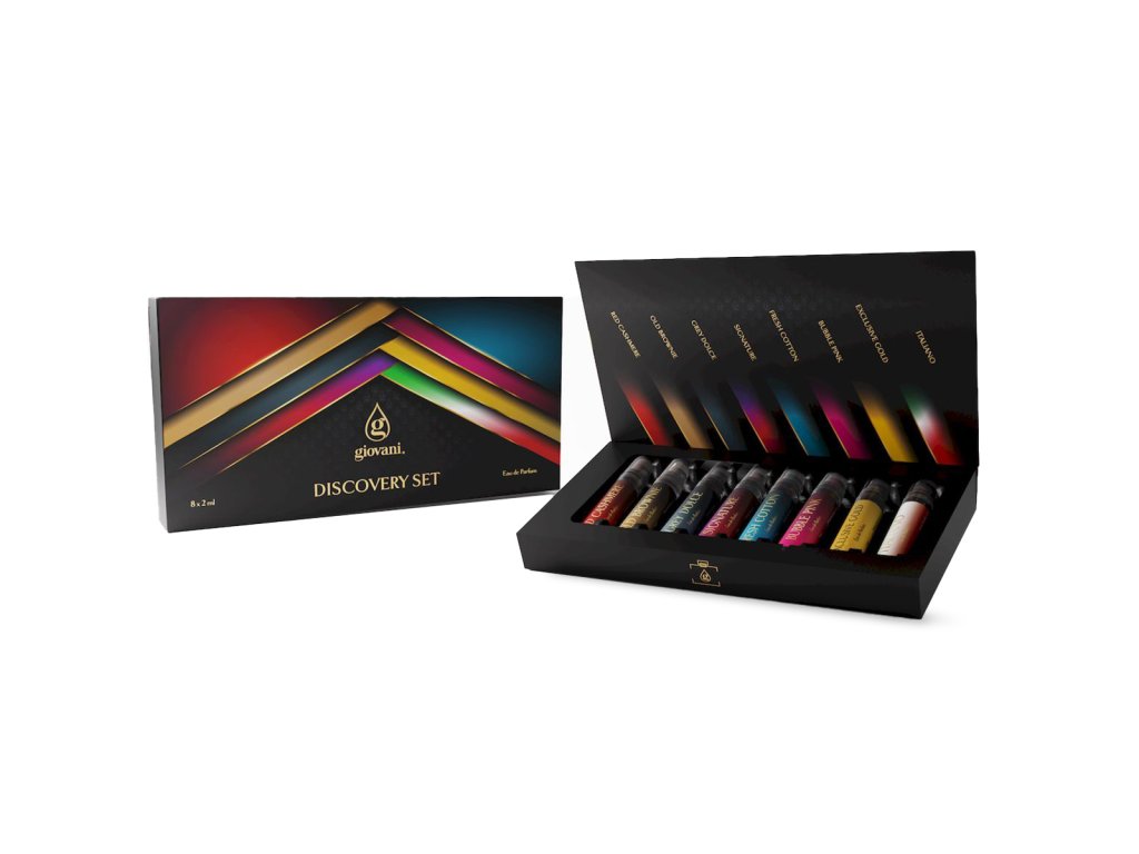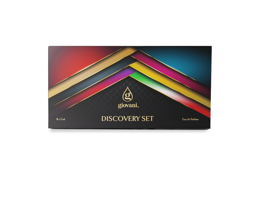 Deze exclusieve Discovery Set is de perfecte manier om kennis te maken met en te genieten van het volledige parfumassortiment van Giovani® voordat u grote flacons bestelt. In een luxe doosje met metallic gouden 3D-details vindt u acht parfums die de verschillende karakterlijnen van onze collectie vertegenwoordigen, van zoet en fris tot verfijnde kruidige tonen.Elke tester is een volwaardig parfum in een klein formaat, ideaal voor onderweg of in uw handtas.