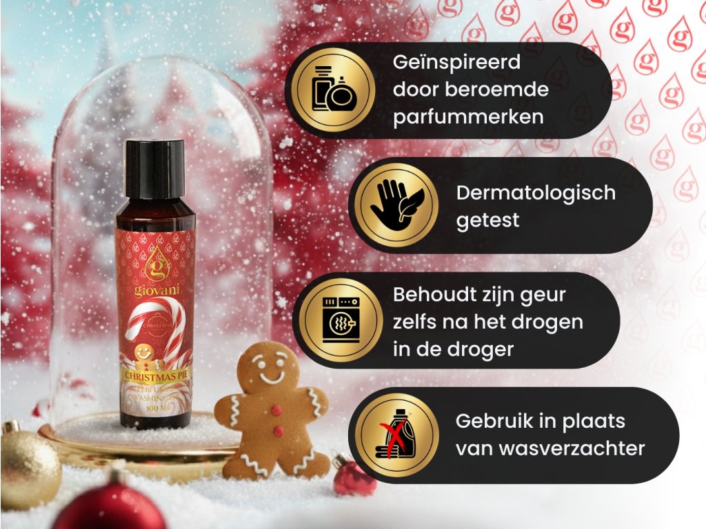 Stel je de geur van kerst voor en de sfeer die in de lucht hangt. De kersteditie van Giovani® CHRISTMAS PIE wasparfum omhult je was en je huis met een feestelijke sfeer die wekenlang blijft na elke wasbeurt