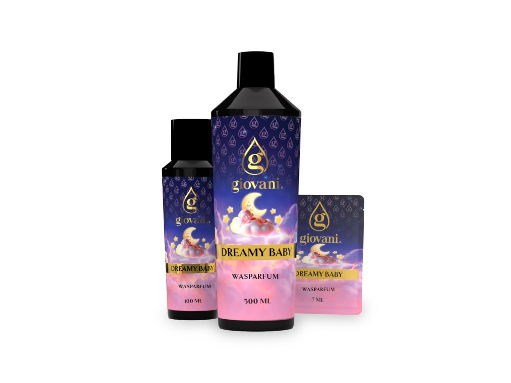 De geurige essences van het wasparfum Giovani® DREAMY BABY zijn bloemig-poederig met een vleugje frisheid. Verfrissende groene tonen en bergamot openen de weg naar het zachte hart van de geur, waarin oranjebloesem, roos, jasmijn, viooltje en Peruaanse heliotroop samenkomen. De basis wordt gevormd door fluweelzachte muskus, romige vanille en warme sandelhout. Deze harmonieuze compositie verwent de zintuigen en is tegelijkertijd zacht voor zelfs de meest gevoelige huid.