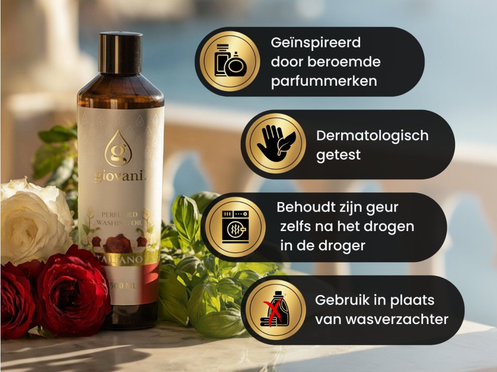 Plaats het parfum niet in de trommel van de wasmachine of in de droger. Ze zijn direct bedoeld voor gebruik in het wasverzachterbakje. Je hoeft je geen zorgen te maken dat je wasgoed zijn geur verliest na het drogen in de droger. Giovani® parfums zijn bestand tegen externe invloeden en duurzaam. Gewassen wasgoed zal zelfs na gebruik van de droger blijven ruiken. De optimale temperatuur voor het bewaren van wasoliën is ongeveer 15–25 graden Celsius.